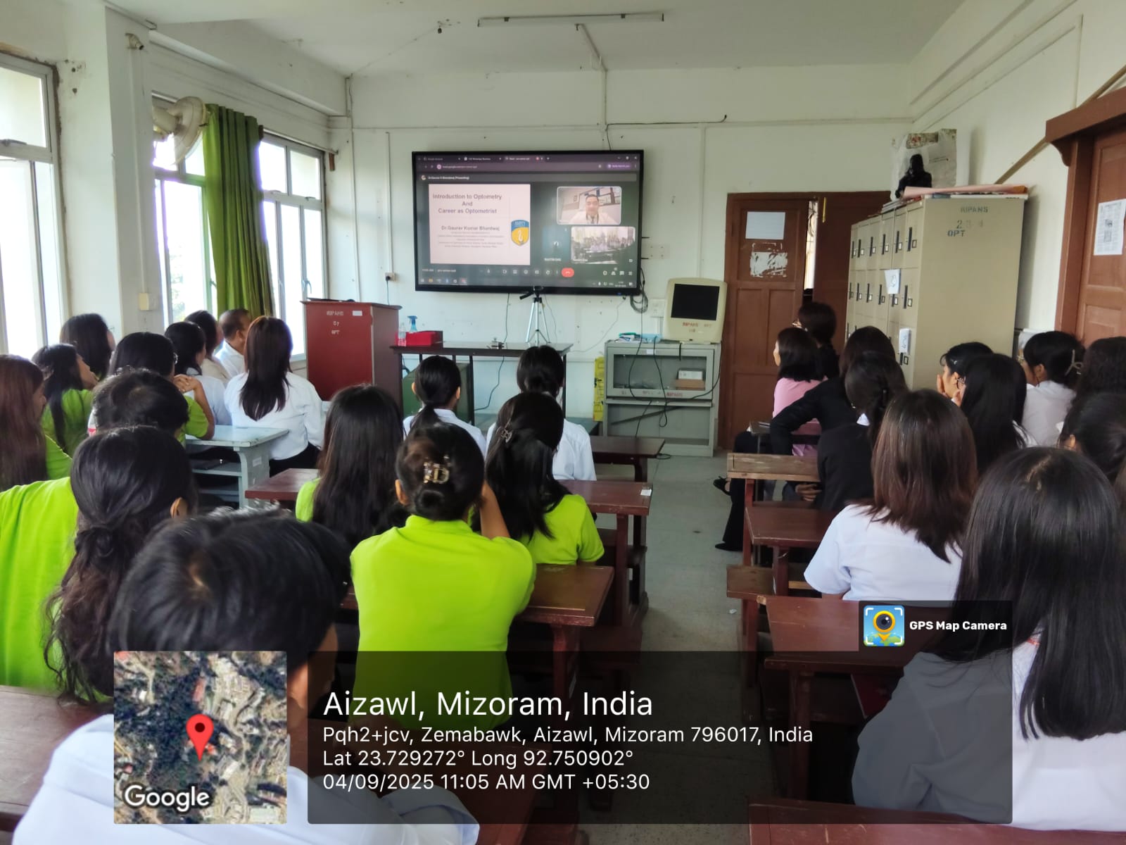 An online Career Counselling Seminar in Optometry was held on 4th September 2025 for the 1st and 3rd semester students. The seminar was convened by Mrs. Amy Lalnunsiami.. Dr. Gaurav Bharadwaj, Head of Department, Amity University, Gurugram, was the guest speaker. He discussed diverse career opportunities in Optometry under the National Allied Health Science Act, including roles in vision therapy, contact lens practice, squint management, corneal retrieval, and even spectacle design. He also stressed the importance of research in advancing the profession.