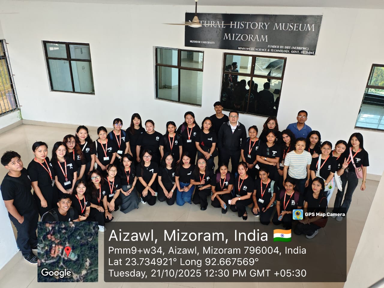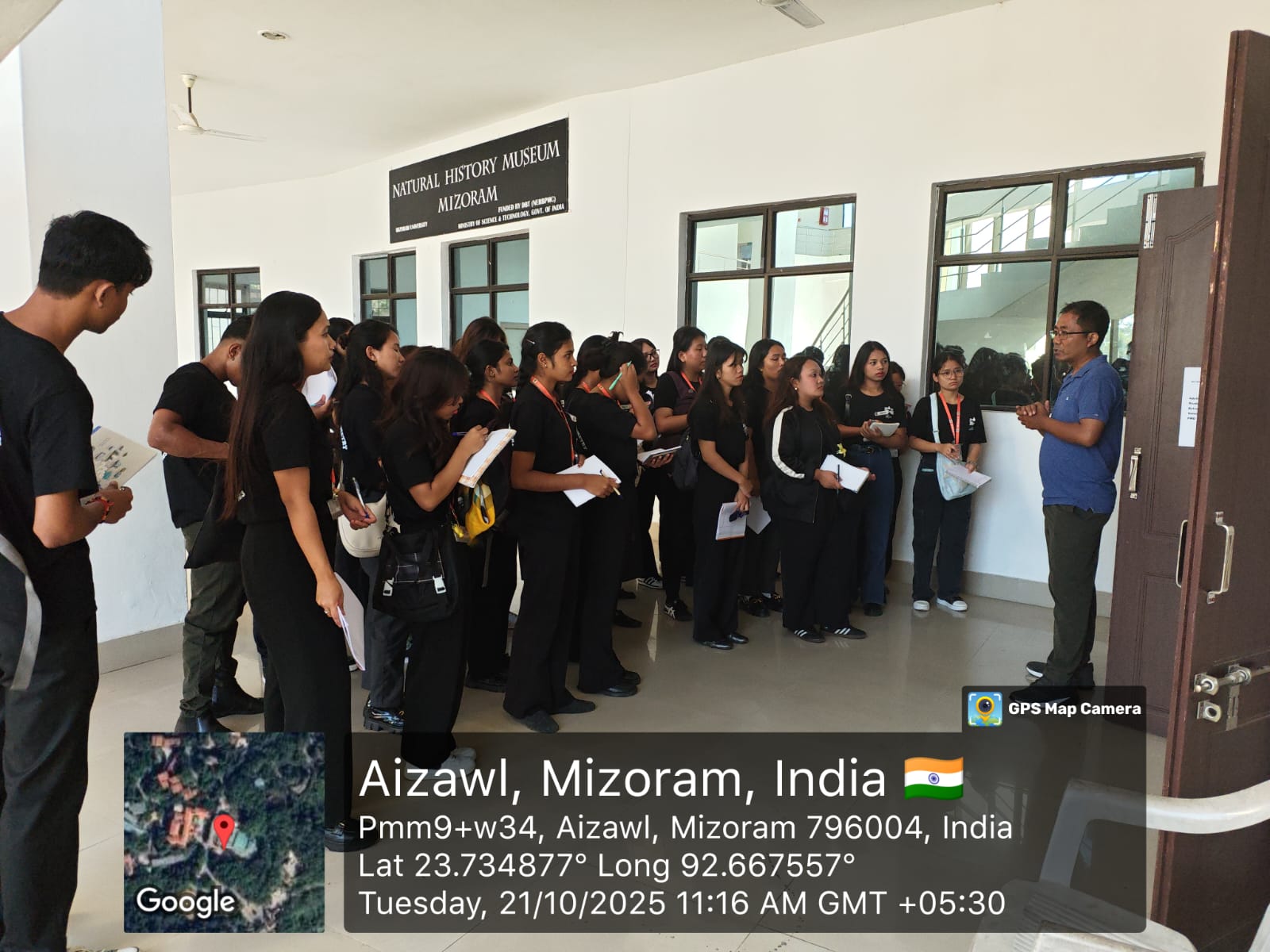 On 21st October 2025, the 5th semester B.Optometry students visited the Natural History Museum, Mizoram University as part of their Environmental Studies practical syllabus.The group departed at 9:30 AM and reached the museum at around 11:00 AM. Before the tour, a briefing and demonstration session was conducted by Dr. Lalrotluanga, the museum curator. He explained the various species preserved in the museum and detailed the preservation methods used.The museum features a wide range of specimens—reptiles, plants, moths, and more—all native to Mizoram. Students had the opportunity to observe endemic and endangered species, as well as recently discovered plant species from the state.