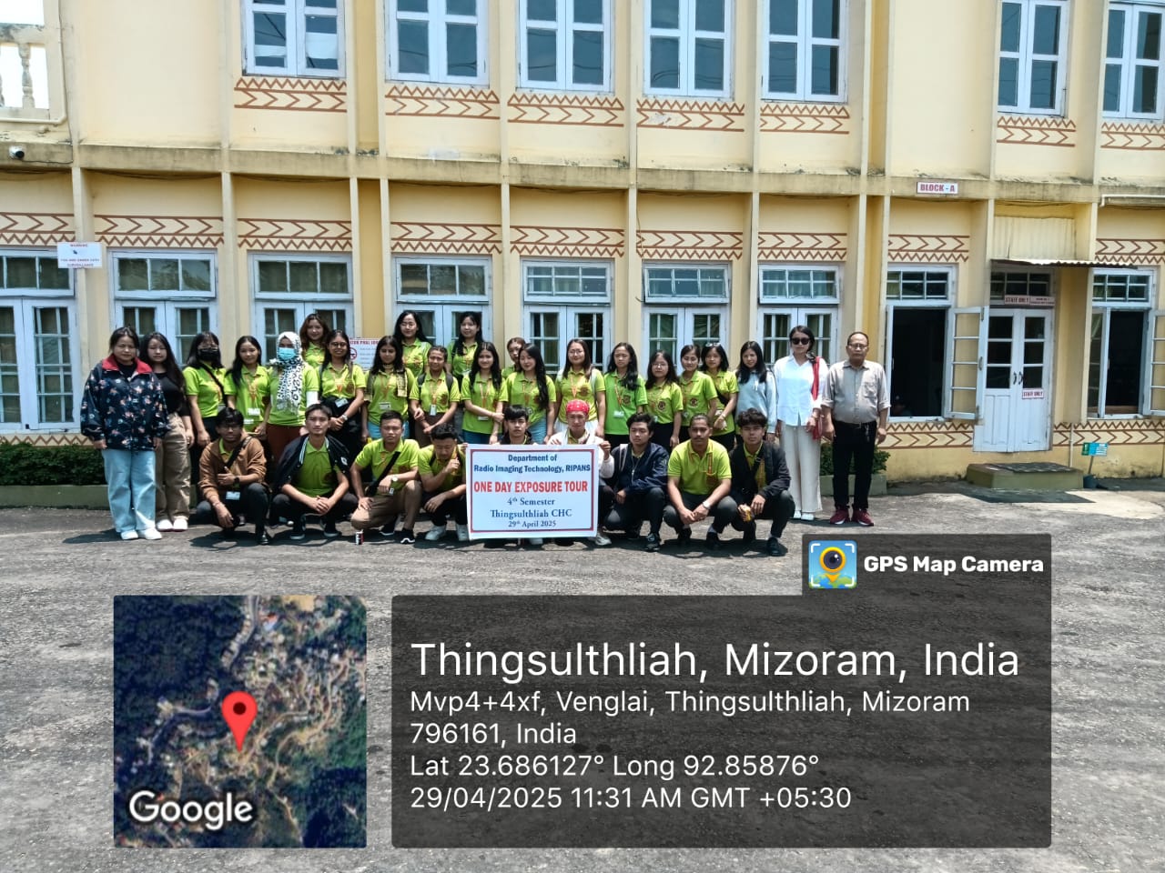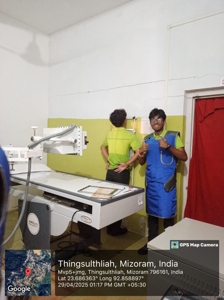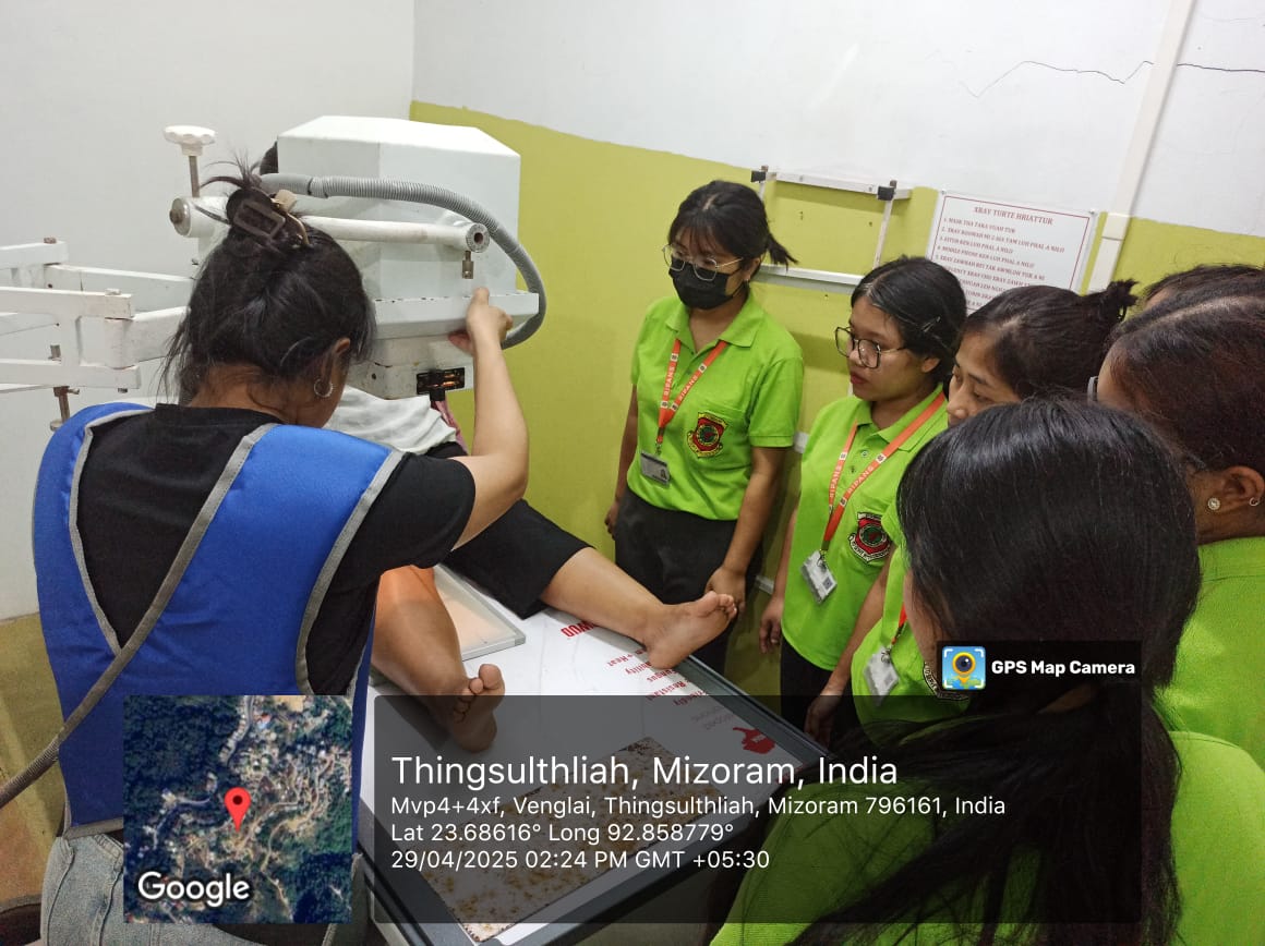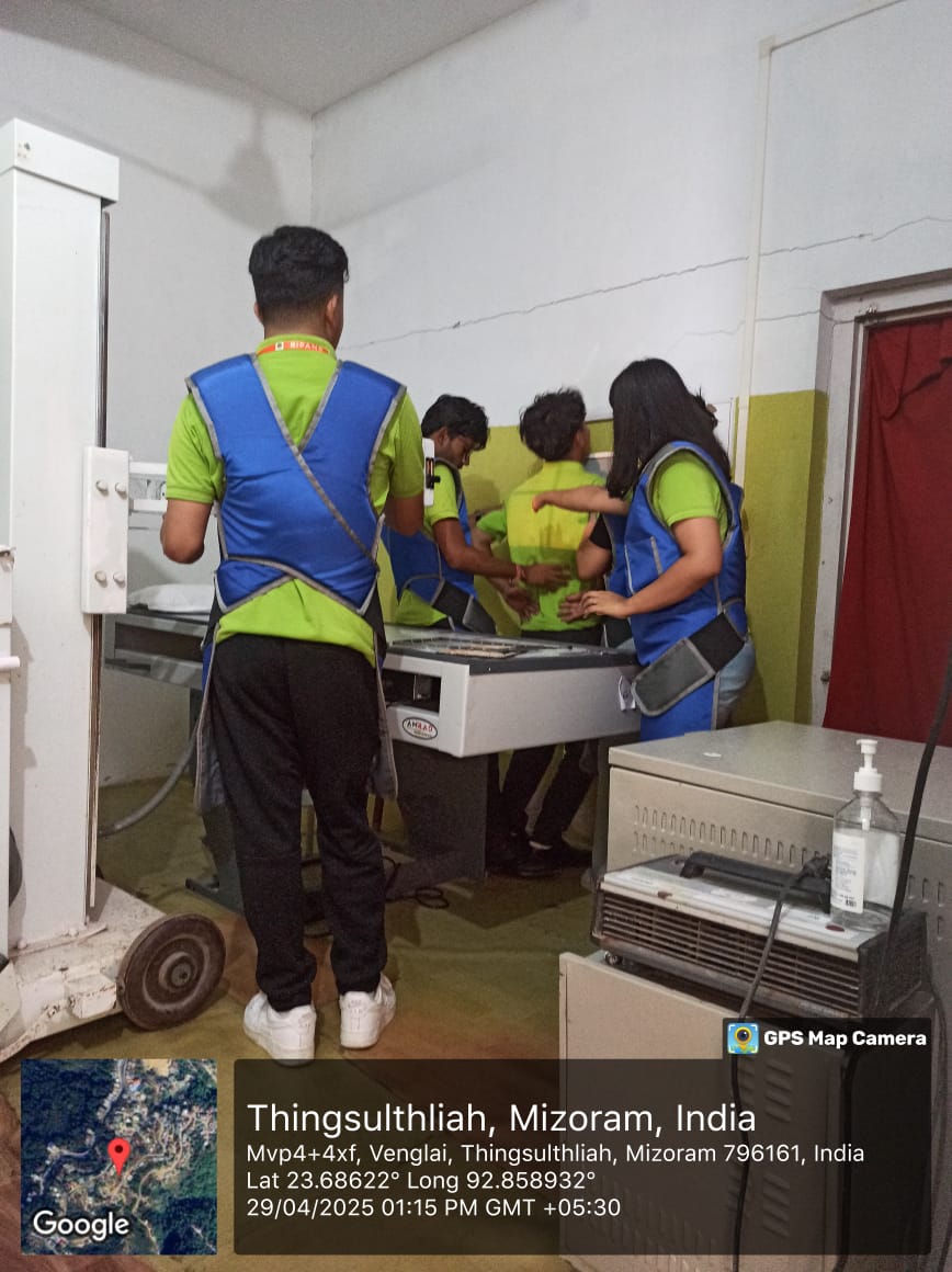 The 4th semester students along with five staffs of RIT department departed from RIPANS campus on 29th April 2025 at 9:30am and reach our destination i.e Community Health Centre (CHC), Thingsulthliah village at around 11:00am. After reaching the place, the radiographer/technician at CHC gave briefing on how the hospital is functioning in the radiology department. The students were divided into six groups and each group was given a chance to learned and performed a radiographic techniques and radiation protection for they are given a protective shield (lead apron for each of the student) by our faculties. Each group that had completed their studies were given lunch and headed back to the college and reached the campus at around 6:30pm.Outcomes/impact:(a) Radiology department work flow was understood and learnt.(b) Radiographic techniques of different body parts were explained and understood practically(c) Use of portable machine and the use of dark room (manual processing of films) was done and understood practically. (d) Knowledge on radiation protection was learnt practically.(e) Use of personal protective device- lead apron was learnt practically by each of the student.